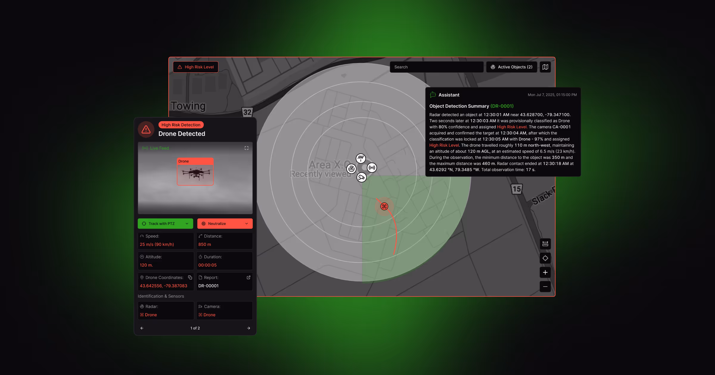 Safeguards airports, prisons, and borders with unified radar, RF, and security feeds for instant alerts.